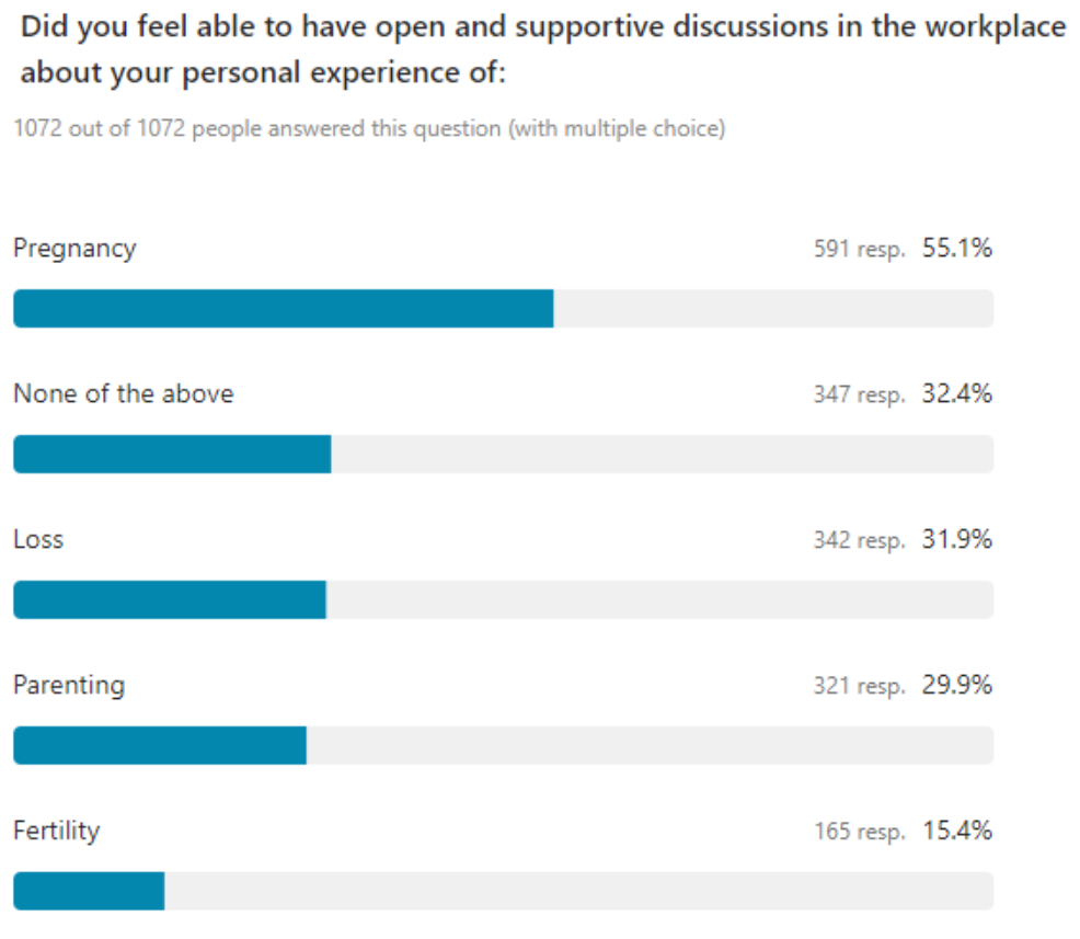 New Tommy’s research** shows that most (55% of 1072 surveyed) parents felt able to talk openly at work about expecting a baby, but this dropped to just 15% for those going through fertility treatment – even lower than people who had lost babies (32%), suggesting a powerful taboo.
