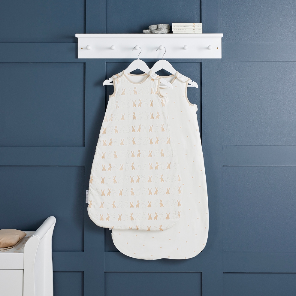 Made from 100% soft cotton, the 2 Pack of Cot Bed Sheets are perfect for ensuring baby stays nice and cosy whilst featuring two distinct designs, perfect for changing up the look but also for ensuring there’s a spare on hand. Designed to coordinate, the Bunnychino Sleep Bag is the perfect way to keep little ones cosy at night without the need for loose covers. Made with 100% soft jersey cotton, the 2-way zipper and popper openings make it easy to get baby ready for bed, and get them out again. Available in sizes 0-6 months and 6-18 months, the newborn design has an all-over bunny print whilst the bigger size sees baby through to toddlerhood with a neutral spot print.