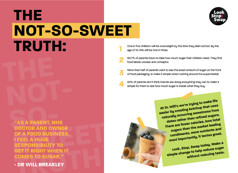 Dr Will Breakey, Co-Founder, Dr. Will’s, said: “Launching our Look, Stop, Swap campaign is a monumental milestone for our business. Our long-term aim is to create more than just a product that helps reduce sugar intake, we want to leave a legacy that ensures parents are making the right dietary decisions for their kids.