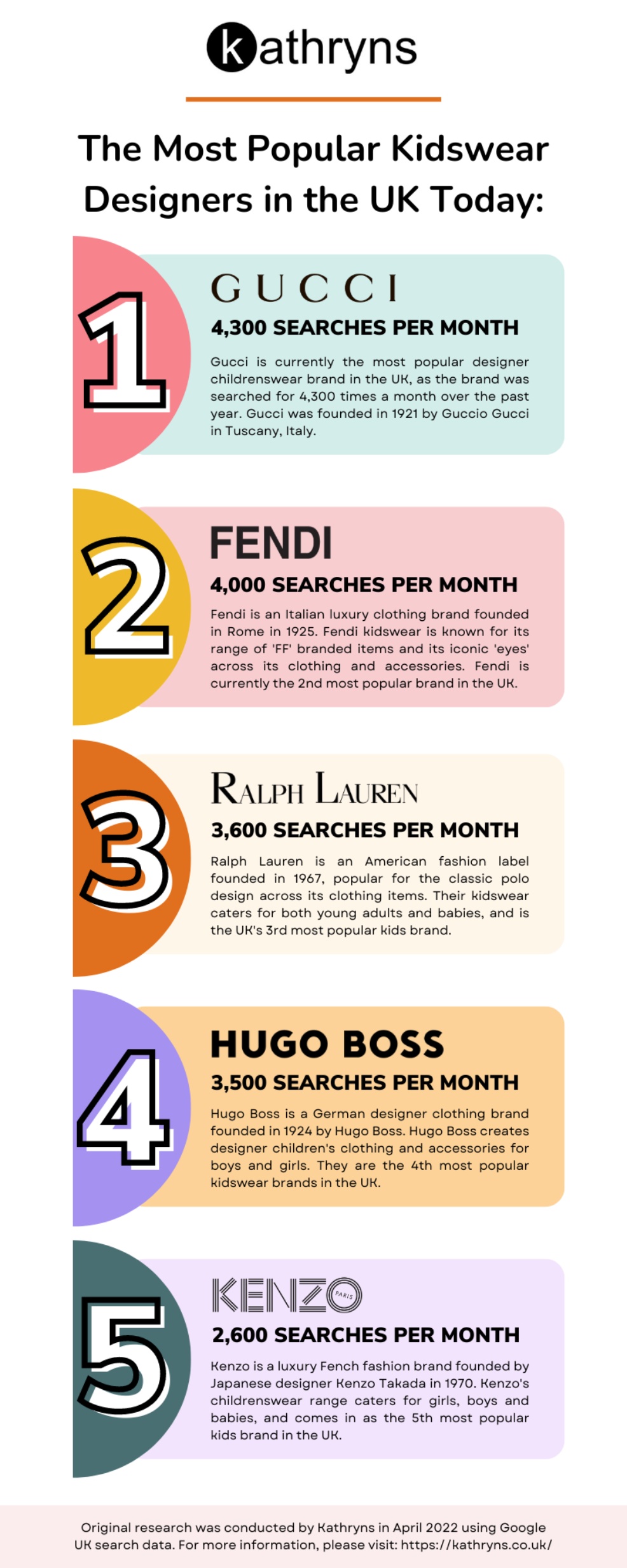 Simon Large, eCommerce Manager at Kathryns, commented: “It’s not surprising that Gucci is the most popular brand given it is an extremely popular brand for adult clothing too - the fact Gucci sells both adult and children’s clothing allows parents to have a mini-me, which is a really popular trend.”