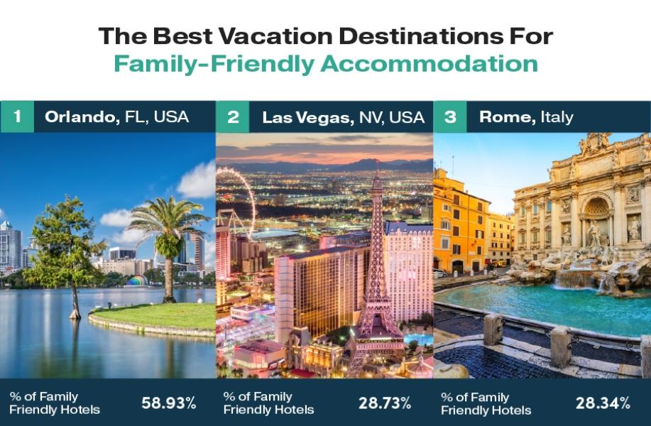 - The best holiday destinations for family-friendly accommodation are Orlando, FL, United States with 58.93% of family-friendly hotels, followed by Las Vegas, NV, United States, with 28.73% of Family-friendly Hotels and Rome, Italy with 28.34% of Family-friendly Hotels.
