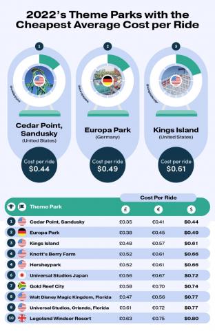 - Cedar Point, Sandusky, US appears 10th on the most expensive list but it actually has the lowest price per ride at £0.35.