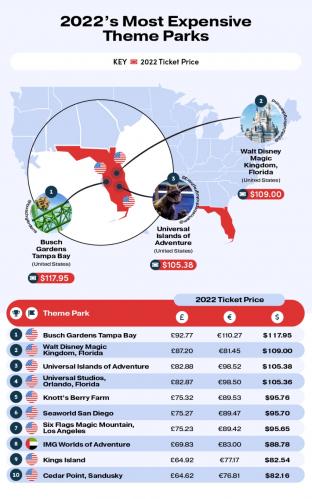 - Ranking in the 1st position as the most expensive theme park in 2022 is Busch Gardens Tampa Bay, Florida which also ranks 1st as the most expensive price per ride