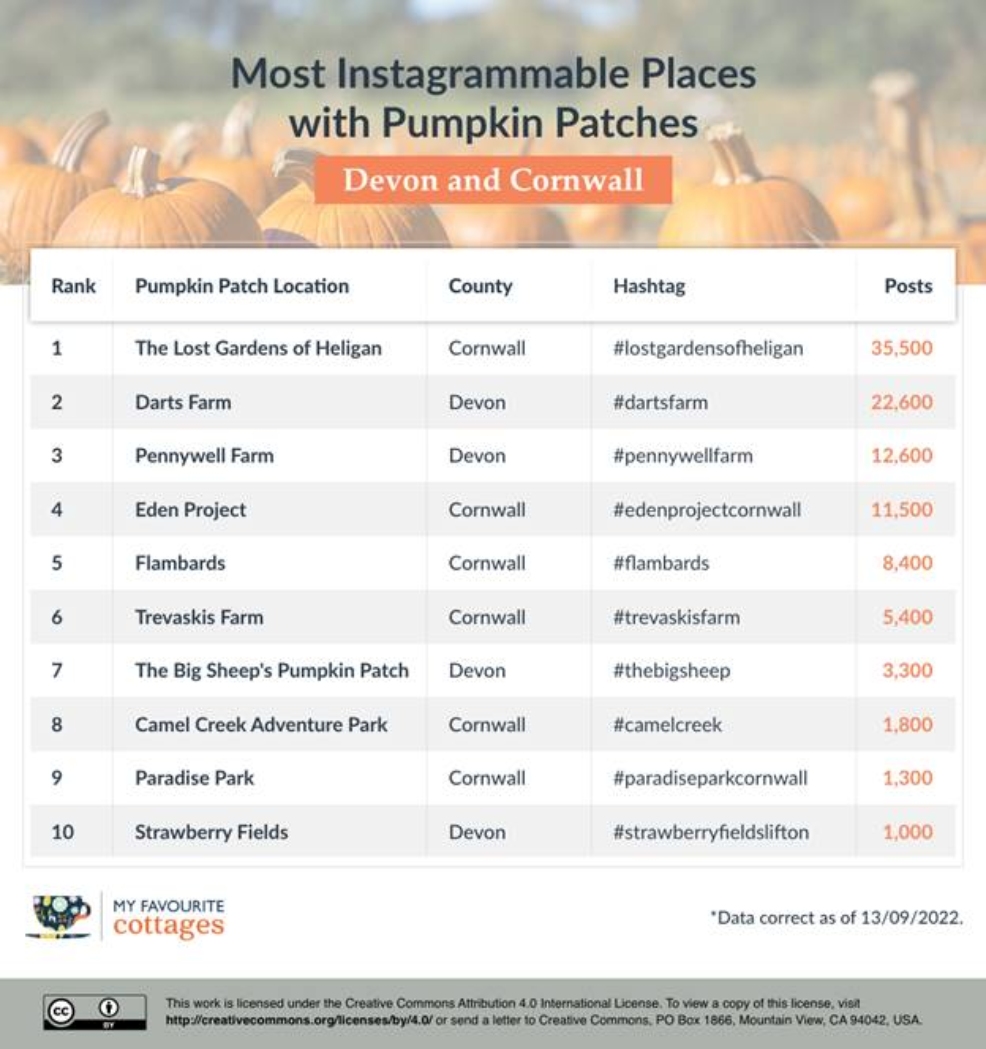 Ahead of the October half-term, My Favourite Cottages investigated which of Devon and Cornwall’s family-friendly destinations with pumpkin patches were the most Instagrammable.