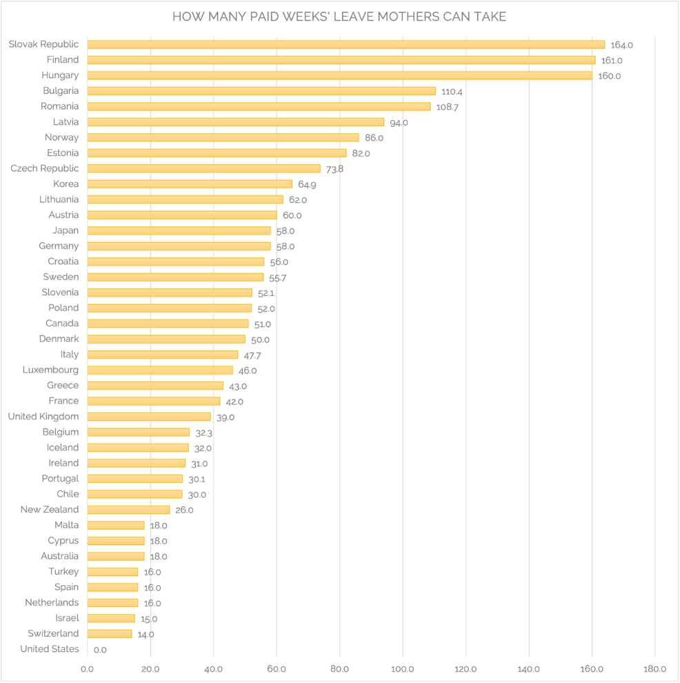 The best countries for the total time allowed for maternity, parental and home care leave are the Slovak Republic (164 weeks), Finland (161 weeks) and Hungary (160 weeks). However, the rates at which mothers are compensated in these countries varies considerably.