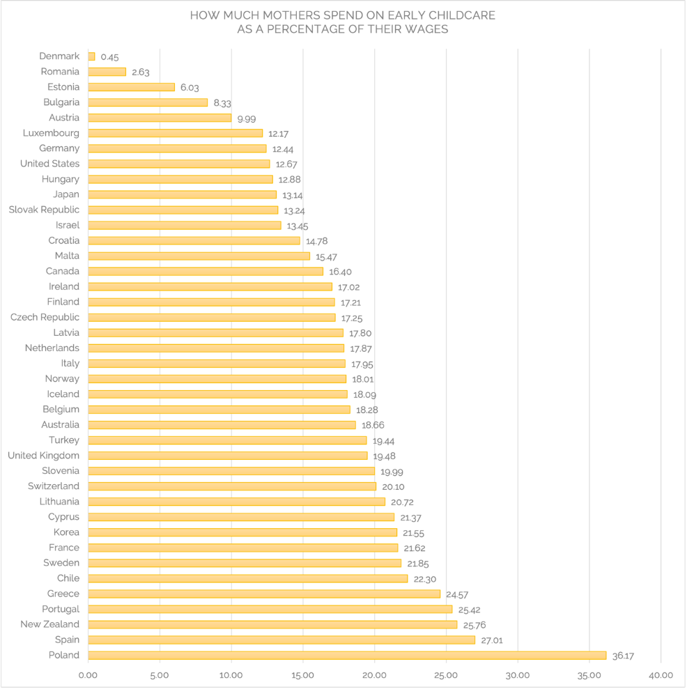 At the opposite spectrum are Poland, Spain, New Zealand, Portugal and Greece, where up to a quarter of mothers’ salaries must go towards the care of their child until the age of two. This number doubles for mothers who are sole caregivers.