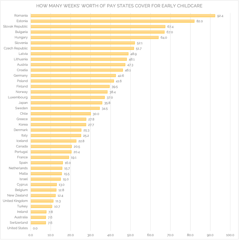 - The most generous country for early childcare-related compensation is by far Romania, followed by Estonia, the Slovak Republic, Bulgaria and Hungary