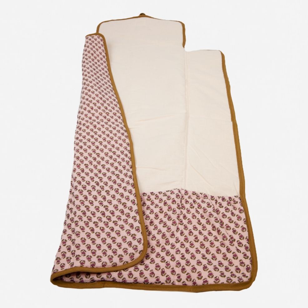 This changing mat is perfect for keeping little ones clean and happy on the go. Lightly padded and super soft to keep your baby comfy during their change, it features a dainty floral exterior with a chic olive-green trim and can be rolled away for easy storage while out and about. An updated version of a signature Five of Us piece, Manon has added a handy interior pocket – perfect for storing spare nappies, wipes or muslins inside!