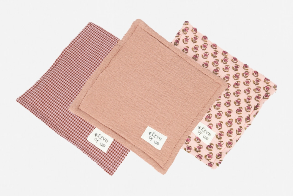 After discovering Five of Us’ larger muslin squares and using them daily with her daughter Fleur, the products quickly became indispensable for Manon. Finding them particularly useful as re-usable wipes on the go, she designed a brand-new trio of mini muslins to serve this very purpose. The set of mini muslins comes in burgundy and blush check, floral and pink, each with extra-absorbent terry toweling cotton on the reverse – perfect for wiping away those croissant crumbs!