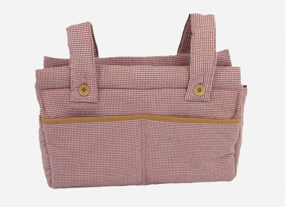 Lovingly handcrafted to button on to your stroller handle, this stroller organiser is a must when on the go. With a burgundy and blush check exterior and contrasting floral lining, the organiser features a large, zippered interior compartment and two handy exterior pouches, while a shoulder strap gives parents the option to carry the bag sans-stroller!