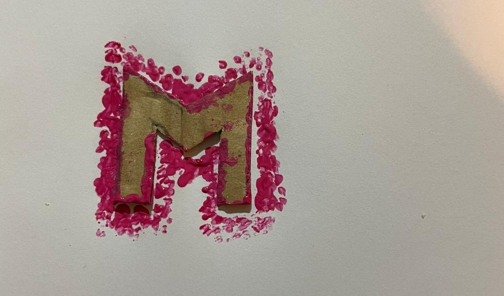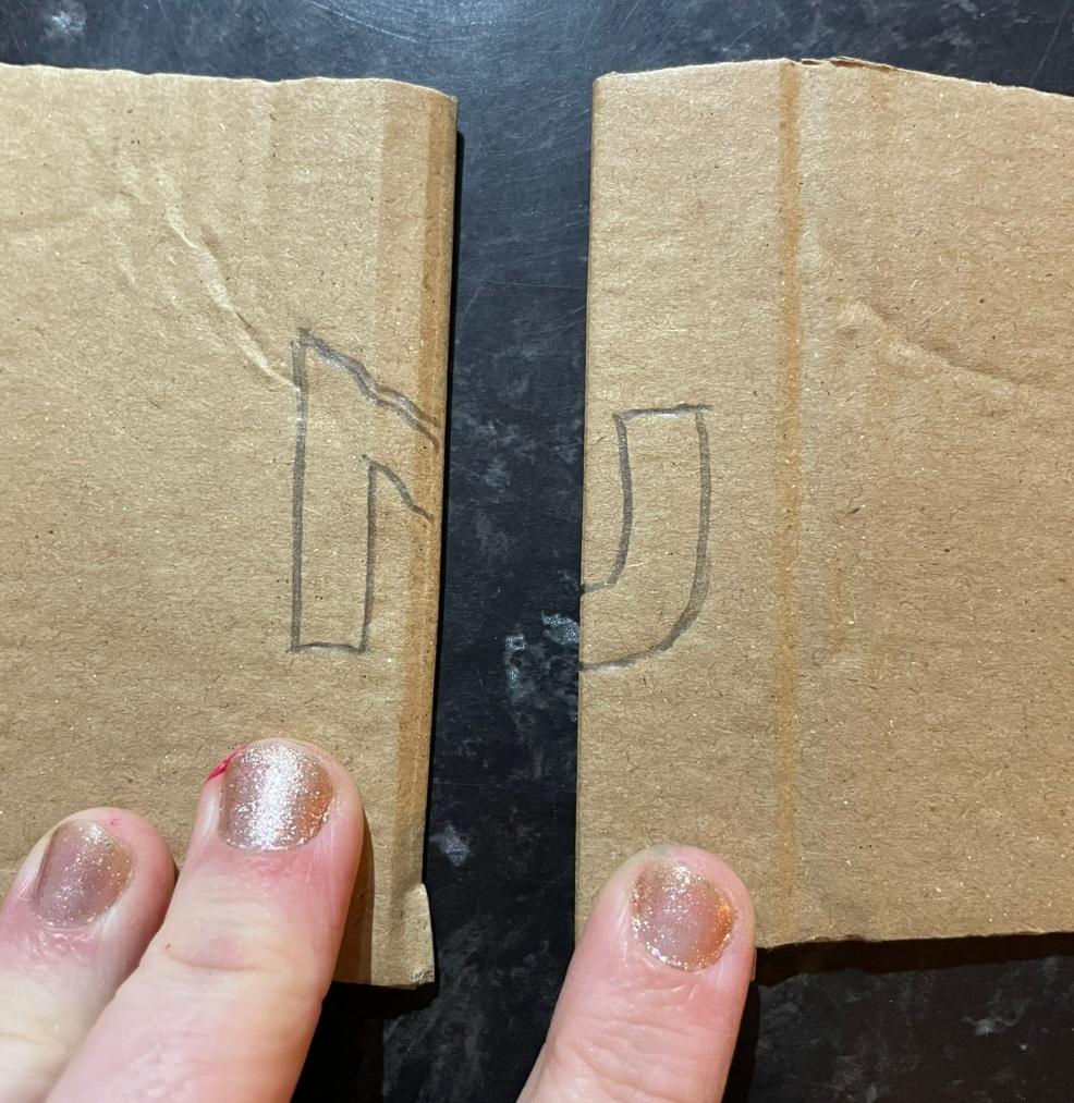 2. Next we made the stencil. For my stencil I decided to use a piece of cardboard and cut the letters 'm' and 'u' out. I am quite particular about things being symmetrical, so I folded my piece of card in half, then drew half of the letters on it so it lined up with the fold. Keeping the piece of card folder I cut around the half letters.