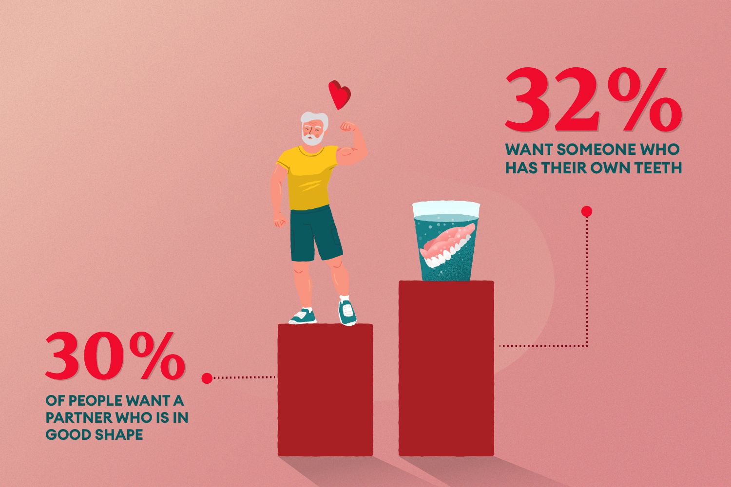 Three in five single over 50s say that a good sense of humour is the number one thing they look for in a partner, while a third are looking for someone who is in good shape, and ideally someone who has their own teeth. Being well read, up to speed with current affairs, and not having been married more than twice are all traits that make a partner more alluring past the age of 50.