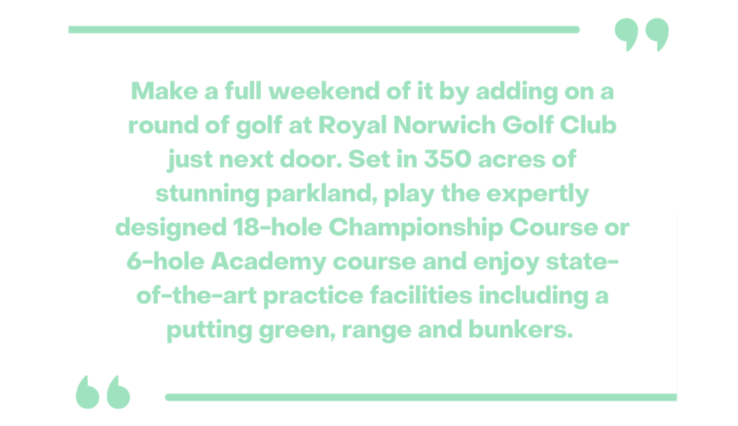 Guests to ROARR! can take advantage of special offers at the Royal Norwich Golf Club including half-day experiences with lunch, range access and green fees for the full 18-hole Championship course from £100 per person. Or upgrade to a full-day treat taking in both courses for £125pp. Those looking for a quick fix can book a round on the 6-hole short course and meal for just £25 per person. Full details can be found at www.royalnorwich.co.uk.