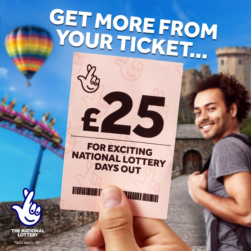From 3 July 2023, National Lottery players can get more from their ticket by heading to the VisitBritain Shop at www.NationalLotteryDaysOut.com and entering the reference number from any National Lottery game (including draw-based games, Scratchcards and Instant Win Games) to redeem a £25 Days Out voucher.
