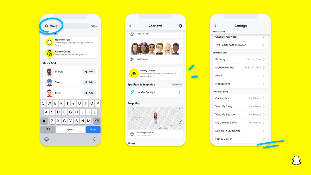 Easy Access to Family Center: For parents who may be unfamiliar with Snapchat, we’re making Family Center easier to find. Now, parents can access Family Center right from their profile by tapping their Bitmoji Icon from the camera, searching relevant terms such as “safety,” “family,” or “parent,” and Family Center will appear, or by heading to settings, located in the top-right corner of the parent’s profile. Our goal is to help both parents and teens who may be new to Snapchat find and join Family Center with ease.