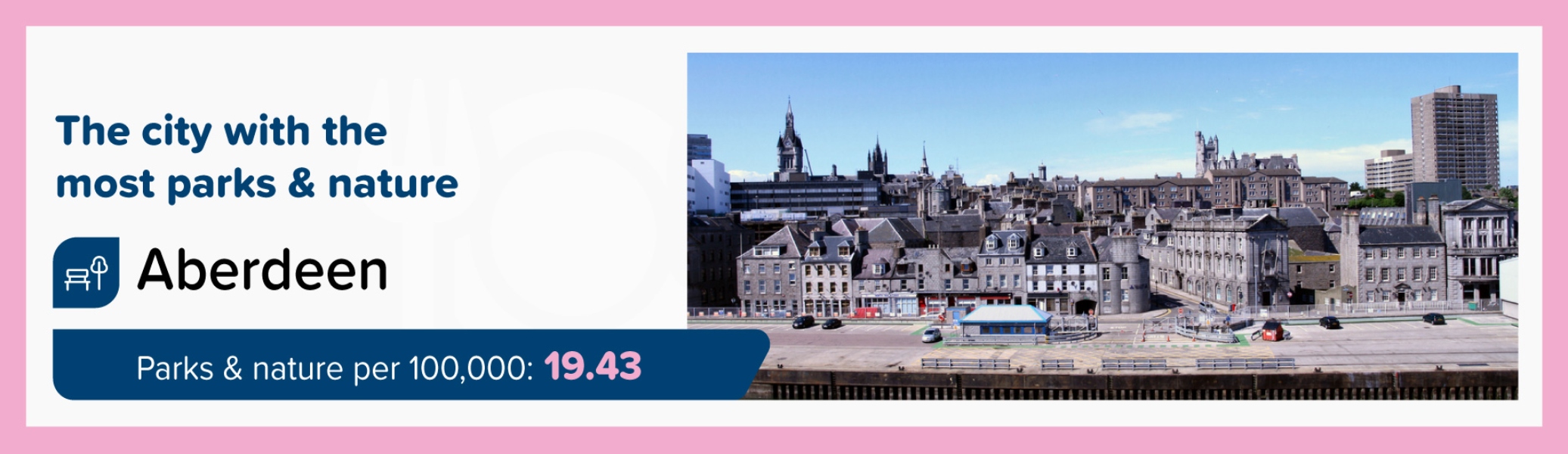 Aberdeen is the greenest city on our list, with 39 parks and nature spaces (19.43 per 100,000 people). Some of the nature sights include Duthie Park Winter Gardens, Hazlehead Park, and Pitmedden Garden & Museum of Farming Life, with its Great Garden dating back to 1675.