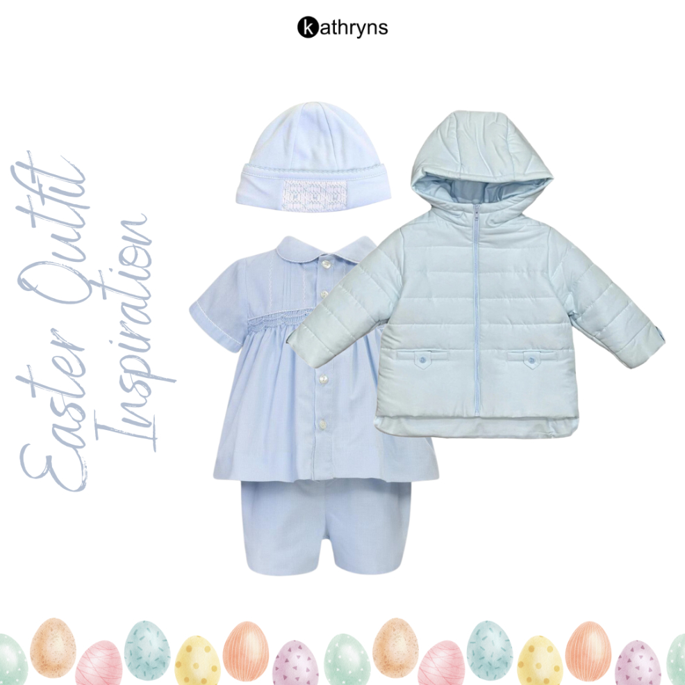 This Sarah Louise Timeless Charm Smocked Set is perfect for dressing up your little angel for Easter. With baby blue shades perfect for Easter, delicate button details and a Peter Pan-style collar, this set brings a vintage-inspired look with a touch of sophistication. Pair this with the Sarah Louise Blue Jacket to keep your little one warm in the ever-changing spring weather, and finish the outfit with the Magnolia Blue Cora And Cole's Hat in a matching baby blue colour to embrace the trendy pastel shades for spring.