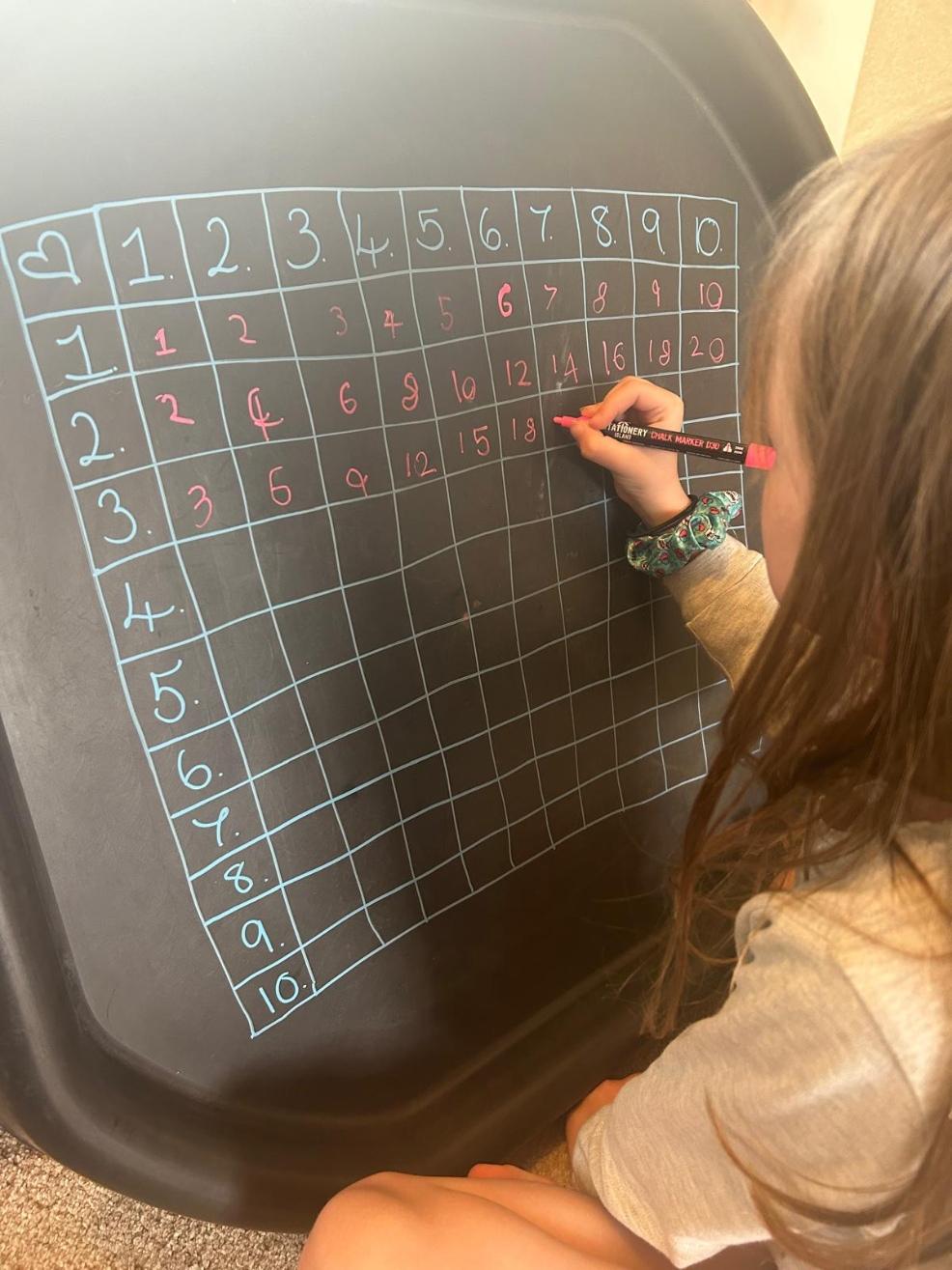 Today I decided to get out the tuff tray and whiteboard pens and draw up a times table grid. For some reason, the tuff tray seems to add an extra bit of fun to any activity. I could have just drawn this out on a piece of paper, but my daughter loved getting out the whiteboard pens and she really enjoyed wiping it all off when she's finished.