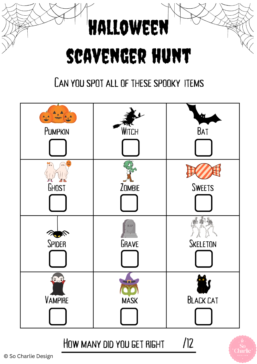 This is a great activity that you can do at home, on the run up to Halloween or on Halloween night itself. All you need is a clipboard and pen and you can set off around your neighbourhood and find as many items on the list. This activity can also work well at a Halloween Party or in a classroom.