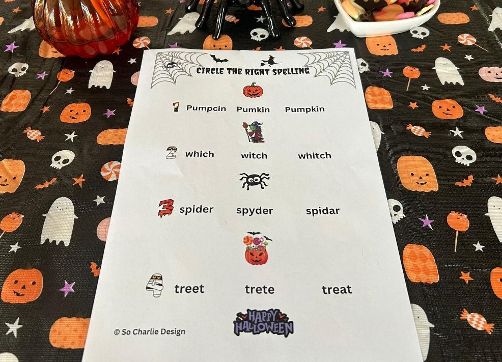This Halloween-themed activity sheet will keep your little ones entertained while boosting their spelling skills! Perfect for parents, teachers, or homeschooling, this engaging worksheet challenges kids to spot the correct spelling of spooky words like "witch," "pumpkin," and "ghost." Ideal for some screen-free fun!