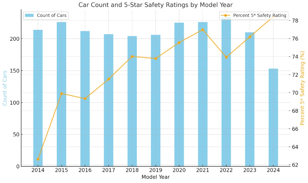 The good news? Cars from 2024 are better than ever and are getting more 5-star safety ratings than previous years. This is likely due to the return of quality materials and an advancement in technology [3]. 2024 has seen a rise in all sorts of technological advancements, from the shift to more impressive electric cars to autonomous driving capabilities and much more.