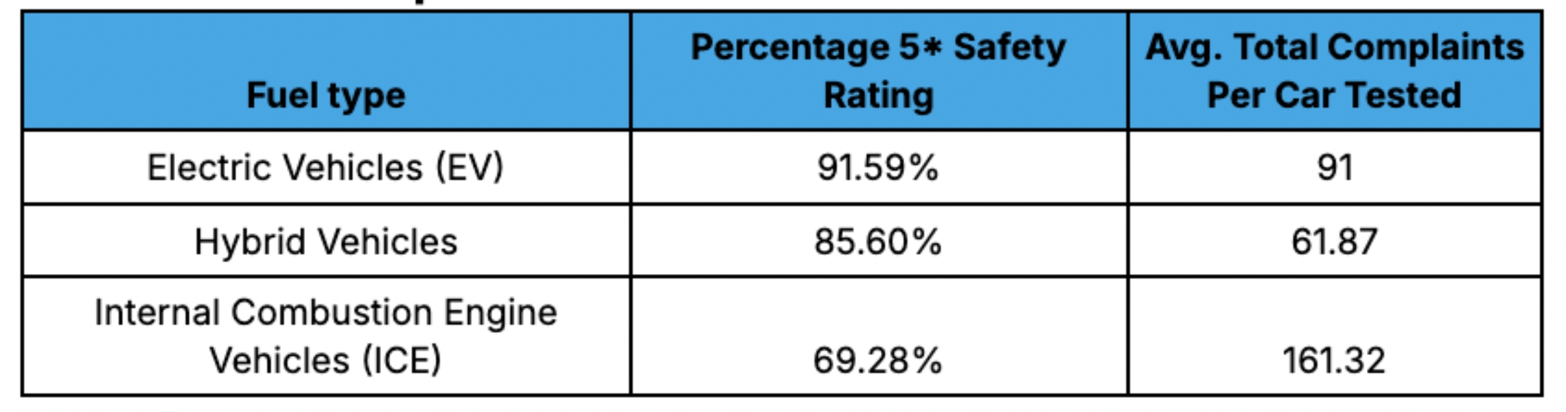 When comparing electric cars (EV) to internal combustion engine cars (ICE), EVs had a much higher percentage of 5-star rated models. EVs score over 91% in safety, with ICE cars falling behind by 69%. While more ICE vehicles are analysed due to EVs being relatively new, this highlights that EVs are entering the automotive space with safety as a top priority.