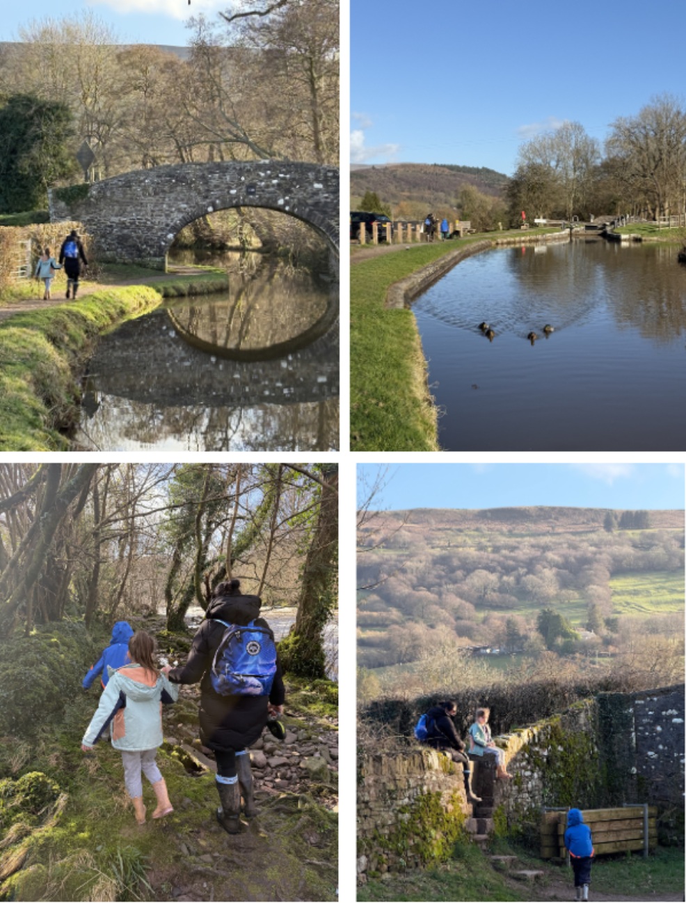 - River Usk Walks: From the café, we followed a footpath (I use that term loosely—it got a bit wild in places!) along the River Usk. The kids loved climbing over rocks, and we ended up at The Coach and Horses Pub. It’s right on the canal, and the beer garden was perfect for our rare February sunshine. The kids played on the swings, we had a drink, and we even made friends with the lovely pub owner, who sorted us out with a takeaway pizza for dinner that night.