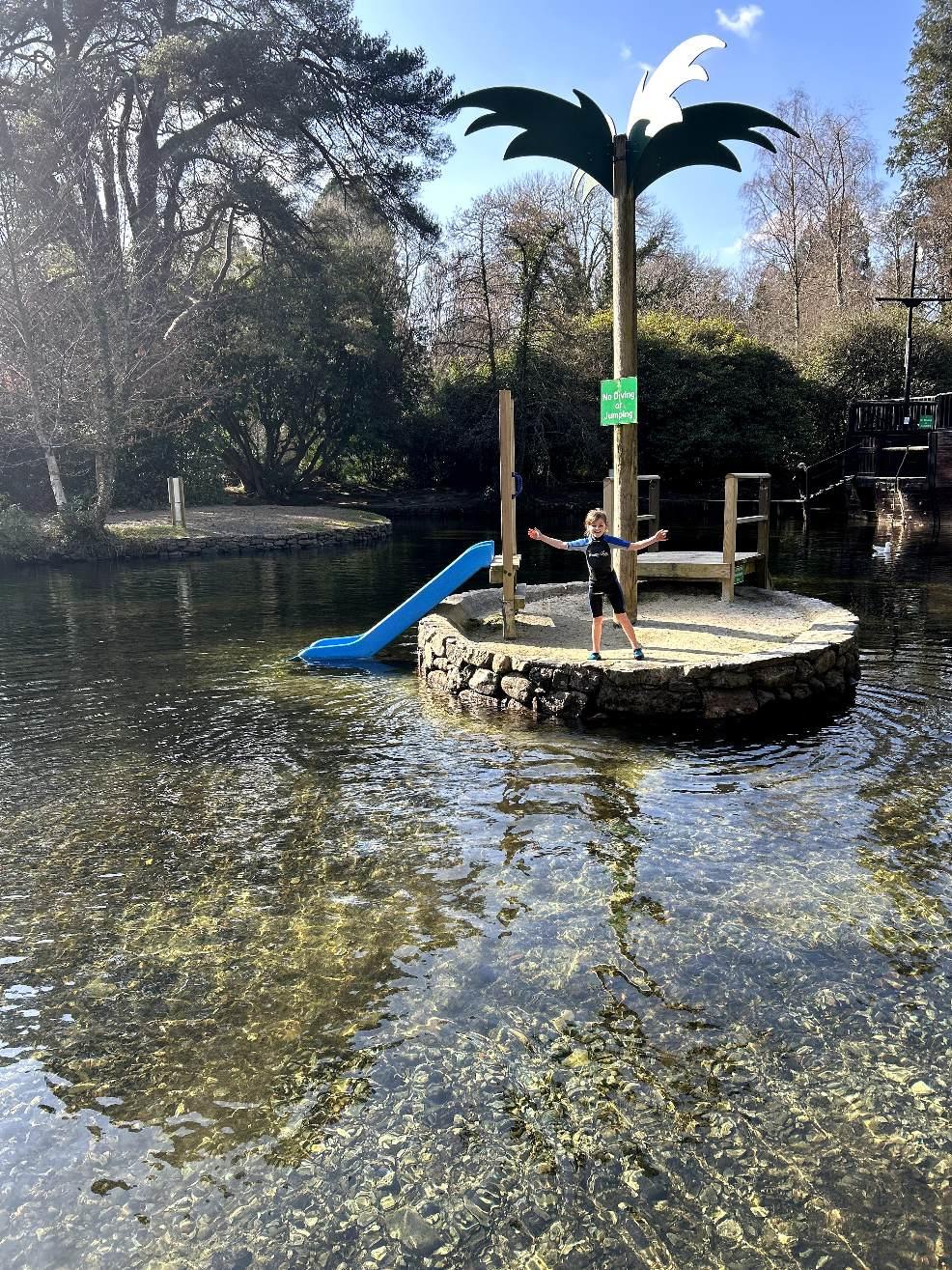 • Pirate Ship and Natural Pool: A highlight of the park was the play area featuring a natural pool and a big wooden pirate ship. Our children loved crossing a wooden plank over the water to board the ship, adding an adventurous twist. Additionally, a small island with a slide leading into the water and a water-based obstacle course with tires and swings were there. Despite the chilly weather, some of our brave youngsters donned wetsuits and fully immersed themselves in the fun. I sat myself at one of the numerous nearby picnic benches, ready with towels and hot chocolates for when they emerged.