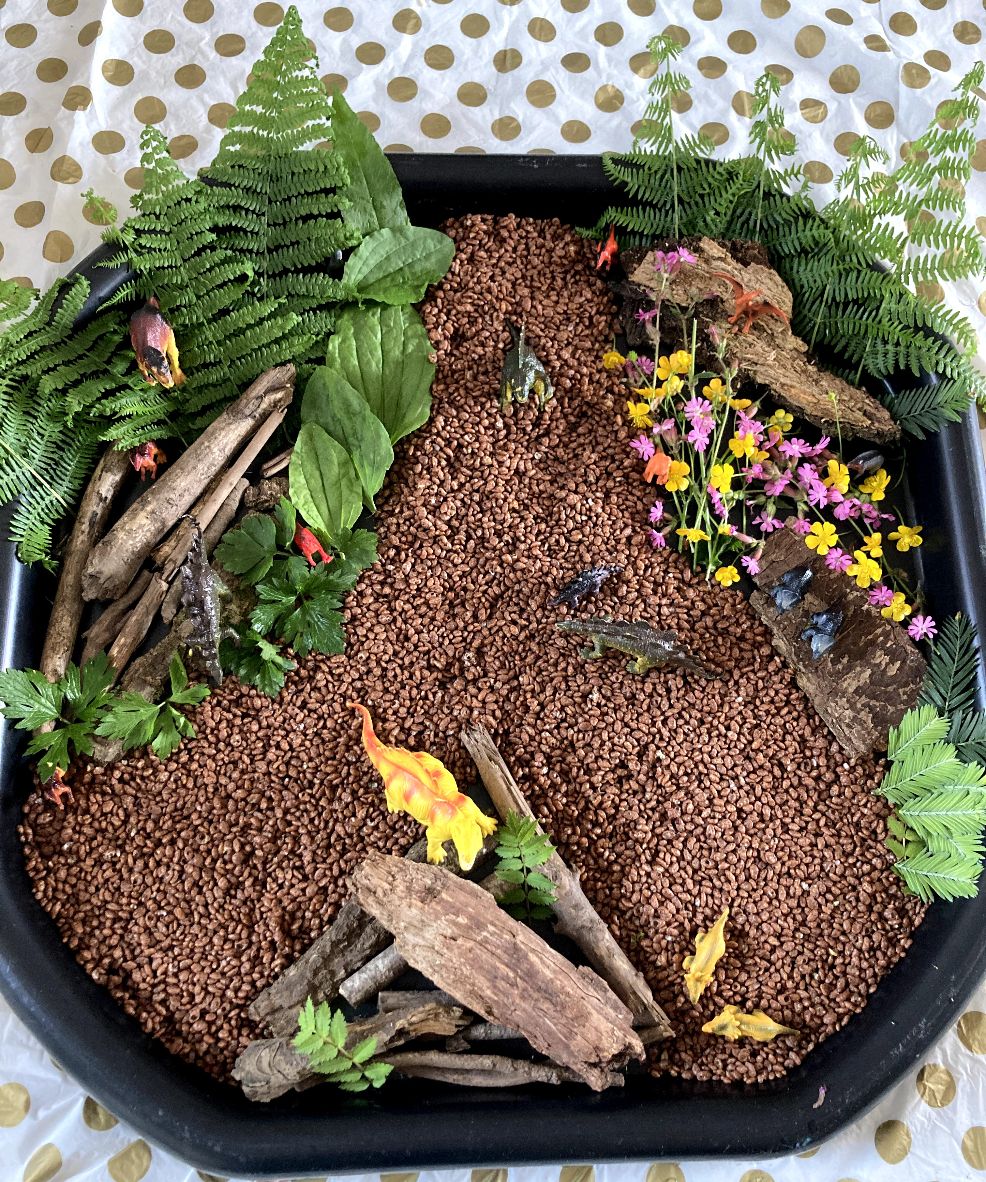 Some of our favourite tuff trays have been based on books. The benefit of having trays outside is that they can be a bit messier. Trays where we have used dry cereal indoors can use mud outside. If you’re feeling really messy, you can put water in them too to create pools or streams for the toys.