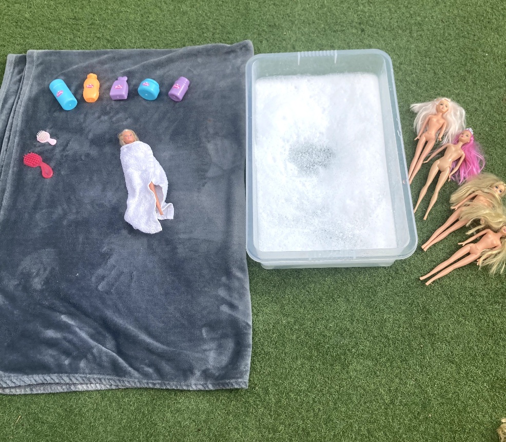 For our activity here my daughter loved giving all of her Barbie’s a really good bath. This activity is another great one for imaginative play and the big bonus is that the toys get a good cleaning the process!