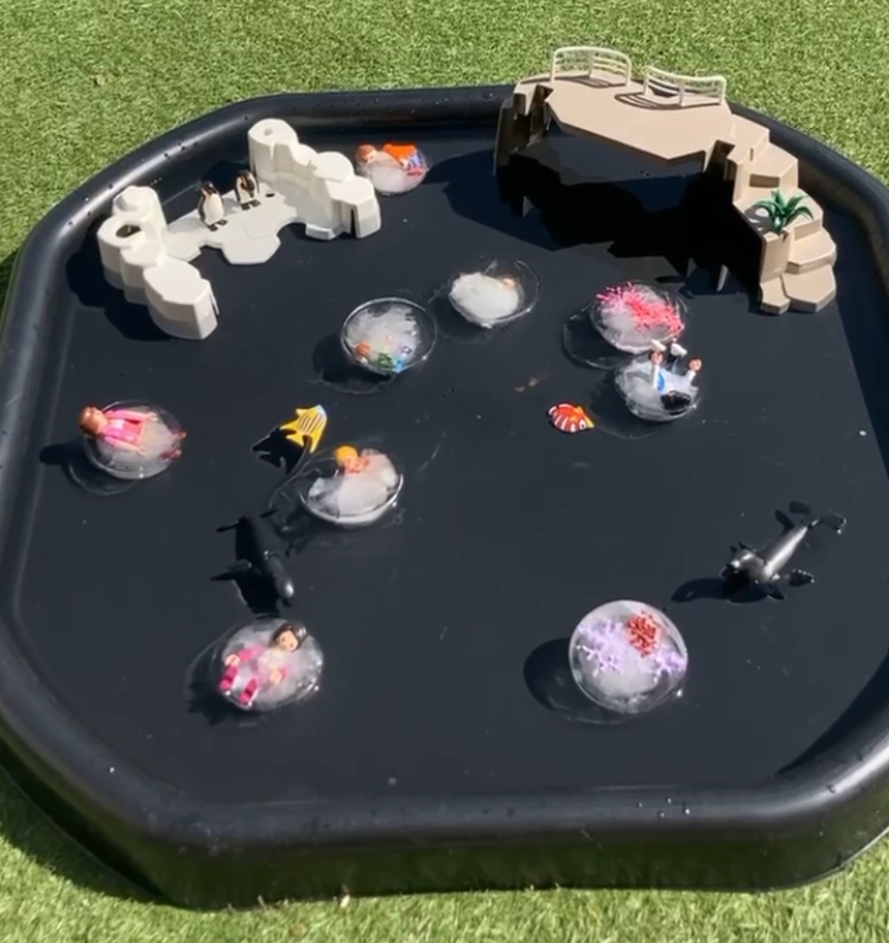 The next day, simply get them out of the freezer and put them in something like a tuff tray (to catch the melted water) then challenge your children to free their toys.