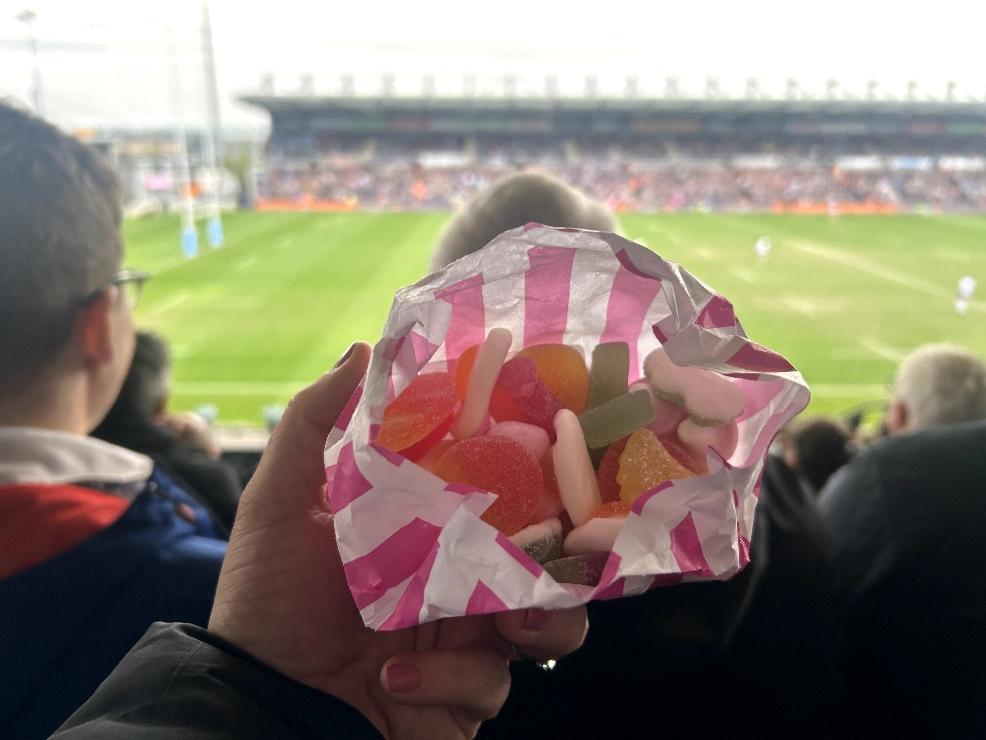 We had the hog roast and cheesy chips—so good, in fact, that we went back for seconds at half-time. There were also sweet bags, which were a huge hit with the kids!