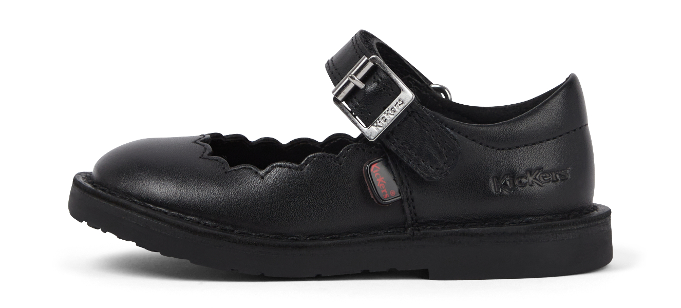 Kickers brings back a timeless icon with a fresh edge. Our beloved T-Bar returns in matte black leather with a chunky sole for extra attitude. Built to last with high-quality materials, it features a deep-grooved Kick outsole for grip, and subtle school-appropriate branding. Perfect for everyday style - this is a classic done the Kickers way.