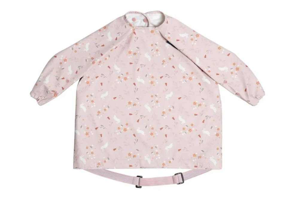 picture of Bibado coverall weaning bib with botanical bunny design, waterproof long sleeve bib for babies and toddlers during mealtimes
