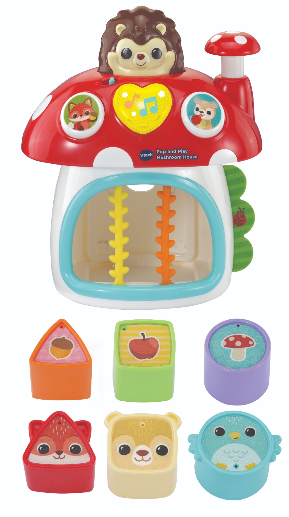 Step into a world of woodland fun with the Pop and Play Mushroom House. Press the mushroom to pop up the friendly hedgehog and enjoy peek-a-boo play, colourful lights and playful sounds. With interactive blocks, textures and shape-matching activities, little ones can build fine motor skills and hand-eye coordination while exploring animals, colours and music in this charming forest home.
