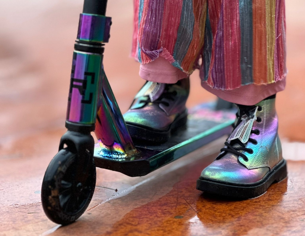 The shimmering rainbow colours of the scooter immediately caught my daughter's eye, perfectly matching her favourite rainbow-colored boots. It's not just a scooter; it's a fashion statement for her, adding an extra layer of excitement to our park adventures.