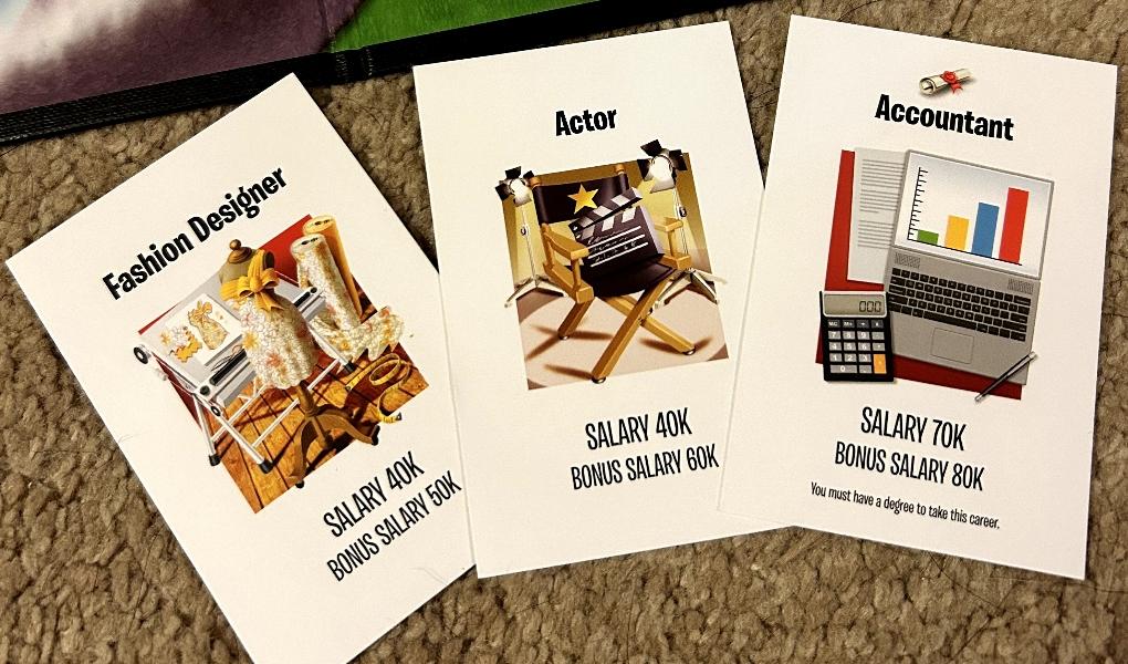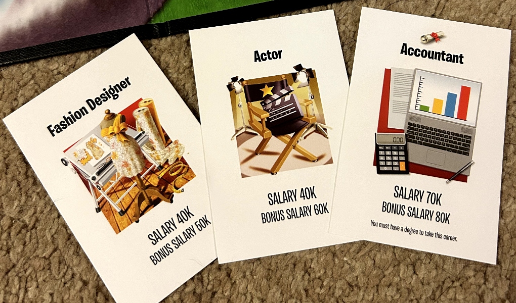 To start the game off you need to decide if you take the college or work route. To start on the college route you need to pay for your education, you start on a separate bit of the board, but this means you have access to better careers as you land on the various career spaces on the board. I personally love this aspect of the game, as initially my children wanted to go straight to work as they didn’t want to pay the money straight up front. Now we have played the game a few times and they have seen how this has played out they really think about this choice, which is great for real life.