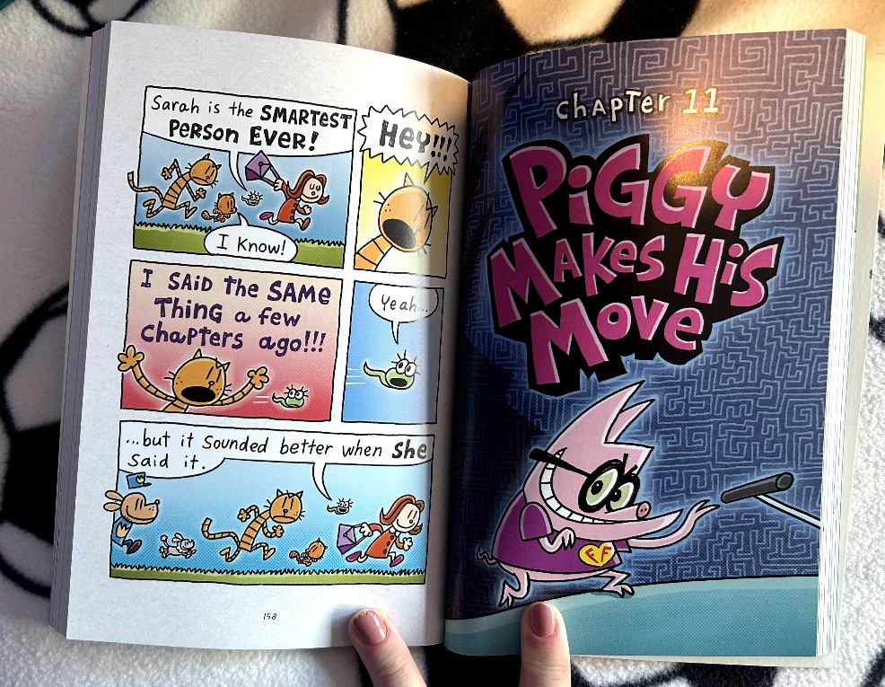 In this latest Dog Man adventure, the fleas are back — this time disguised as a group called the Friendly Friends. But it doesn’t take long before chaos strikes again. Piggy, the villain of the story, starts controlling the fleas to do whatever he wants, and it’s up to Dog Man and his team to step in and save the day.