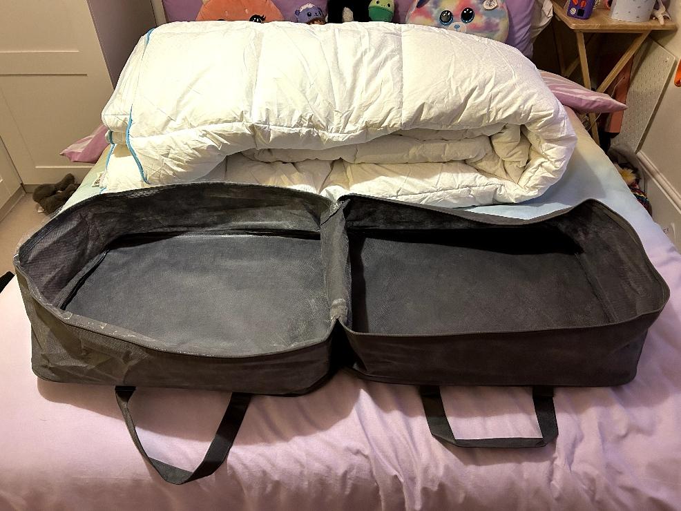 The first thing I noticed when the duvet arrived was the super handy storage bag. If you’ve ever wrestled a duvet into a travel bag before, you’ll appreciate this! It opens fully, making it easy to get the duvet in and out without feeling like you’ve completed a full workout! This means we can easily take it to the grandparents’ house or even on holiday if we want our own bedding.