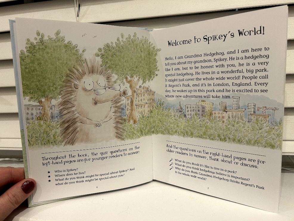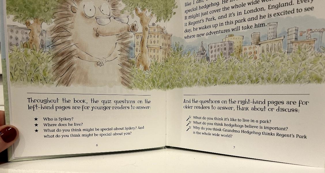 One feature that can bring in all ages of readers is the questions at the bottom of each page. On the left page, there are some questions for the younger readers like “who is Spikey” or “how far did Spikey go” But on the right page, there are more questions like “how do you think Spikey was feeling”.